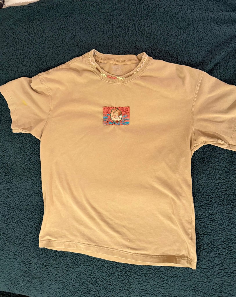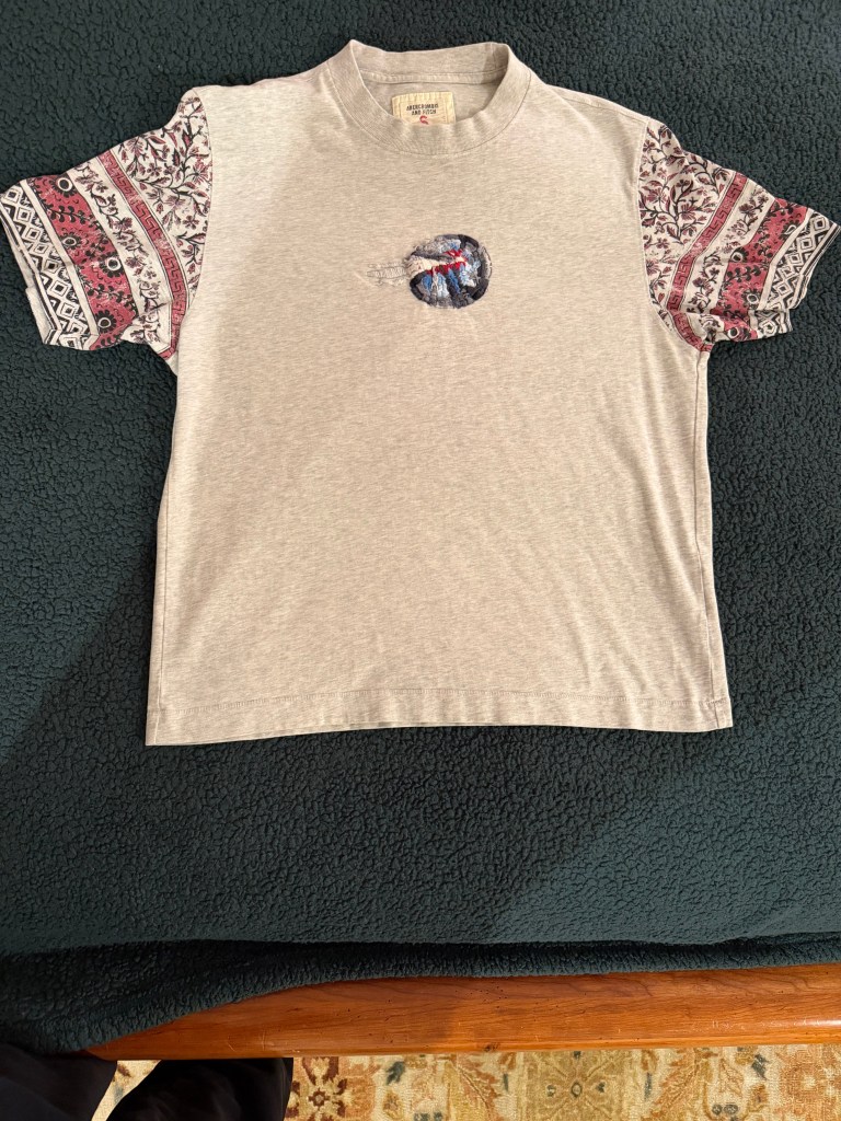Circular Aviary – This shirt started with the multicolored chain stitches on the collar because I wanted to practice technique. Eventually, it evolved into my longest project to date, as the circular bird is surrounded by close to one hundred stitches to from the perfect box, or, in this case, world. I imagine this piece as a bird kept in a box so small that it curves inward on itself, and, though it can see the world outside, has no way to reach it lest the chains come grabbing. – Completed March 30th, 2026.