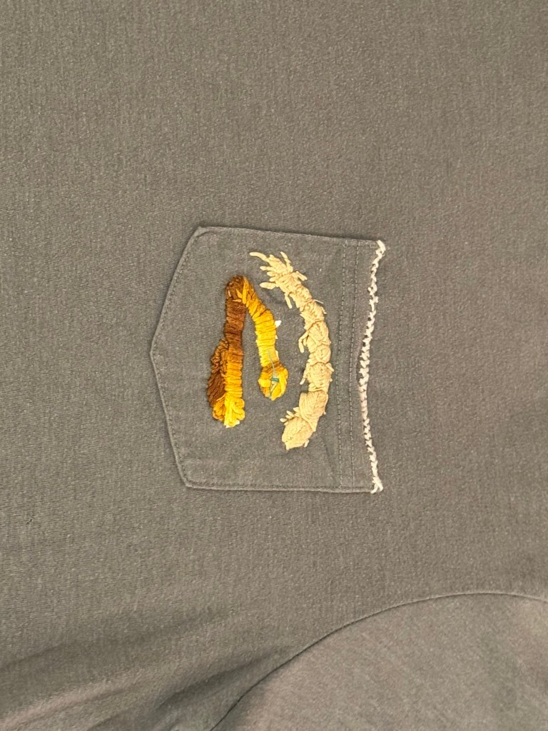 Wonders in and on the Wheat – My first attempt at sewing, as I wasn’t a fan of the pocket on the shirt. The wheat is sewn using a stitch I came up with (though I’m sure I’m not the first to do it) and the tutorial for it is posted under that section. The creature could be either a symbiotic creature with the wheat or just another wheat-eater, depending on how you feel about agriculture pests. I like to think of it as some kind of fabled worm that is more knowledgable. – Completed January 29th, 2026